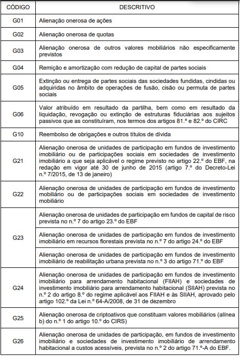 Para as acções (código G01 – Alienação onerosa de ações/partes sociais) já o fez, segundo consigo perceber pelas minhas contas.